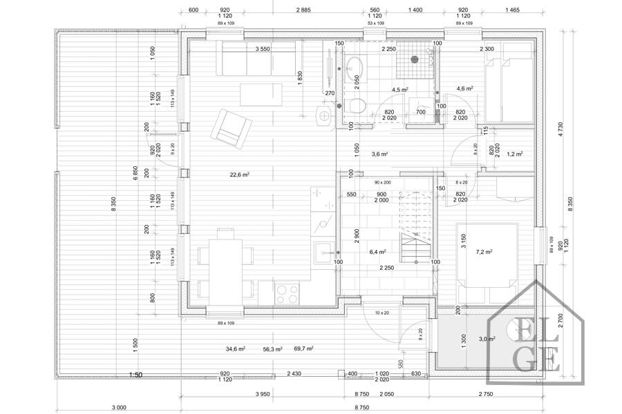 Namelis statomas iš sertifikuotos medienos: konstrukcinė c24, apdailos A,B rūšis. Vidaus apdailai (sienos, lubos) renkamės medžio dailylentes, galimos variacijos eglinės arba pušinės dailylentės (nedažytos). Grindys pušies masyvas.